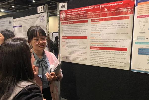 张瑶同学和刘畅老师合作完成的海报《Influence of Course Type and Assignment Features on Students' Information Seeking Behaviors》研究了现实环境中大学生为完成作业而进行的信息搜寻活动和时间管理行为,并探究了课程类型及作业特征这两类行为的影响。研究将认知与信息搜寻行为结合起来,引发了广泛关注和讨论。