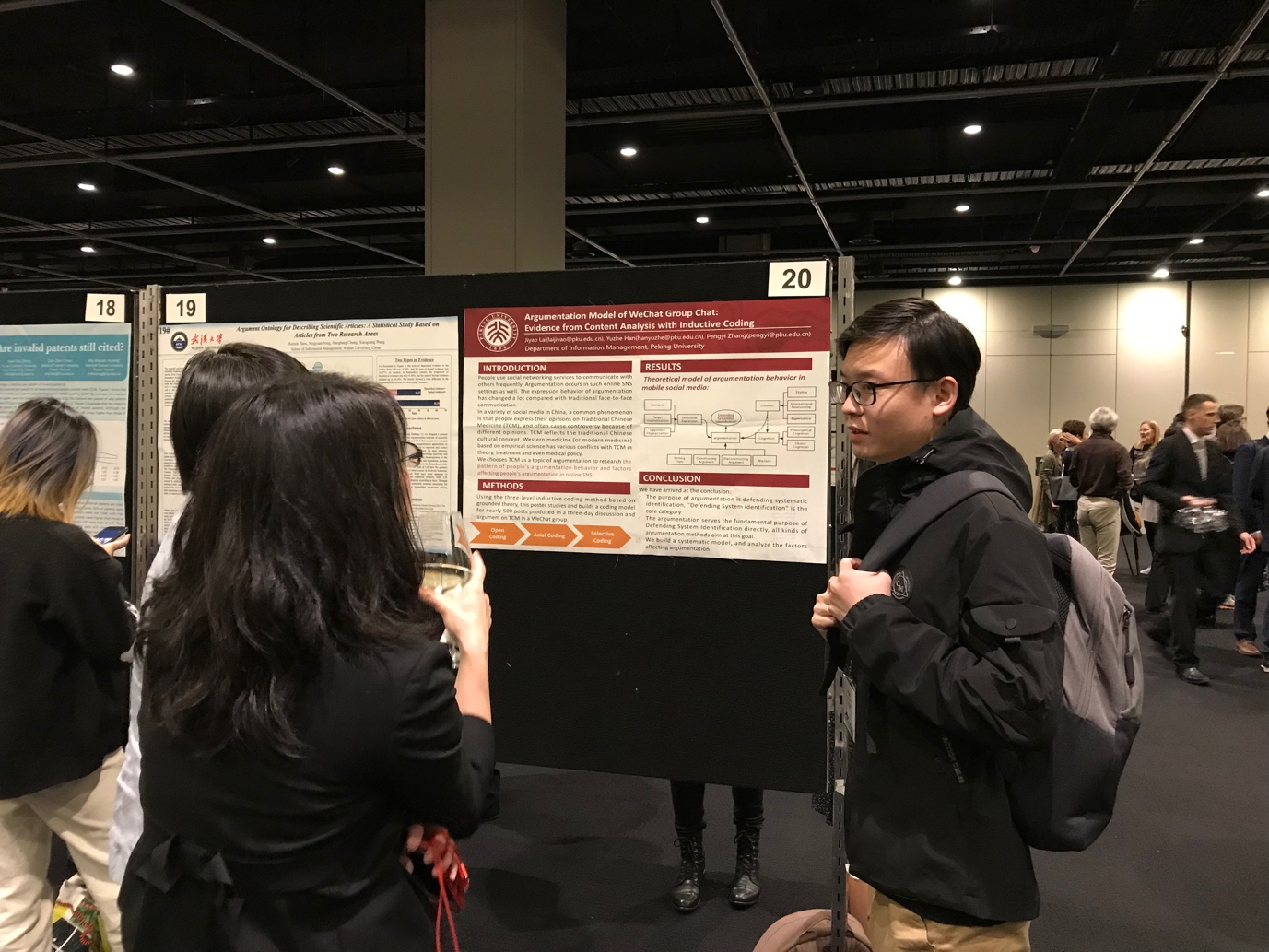 赖纪瑶同学、韩豫哲同学和张鹏翼老师合作完成的海报《Argumentation Model of WeChat Group Chat: Evidence from Content Analysis with Inductive Coding》关注移动社交媒体中的争论这一信息表达和信息交流行为,以微信群中“中医”话题的争论内容为研究对象,引起了不少学者的兴趣,并交流了定性研究的经验。