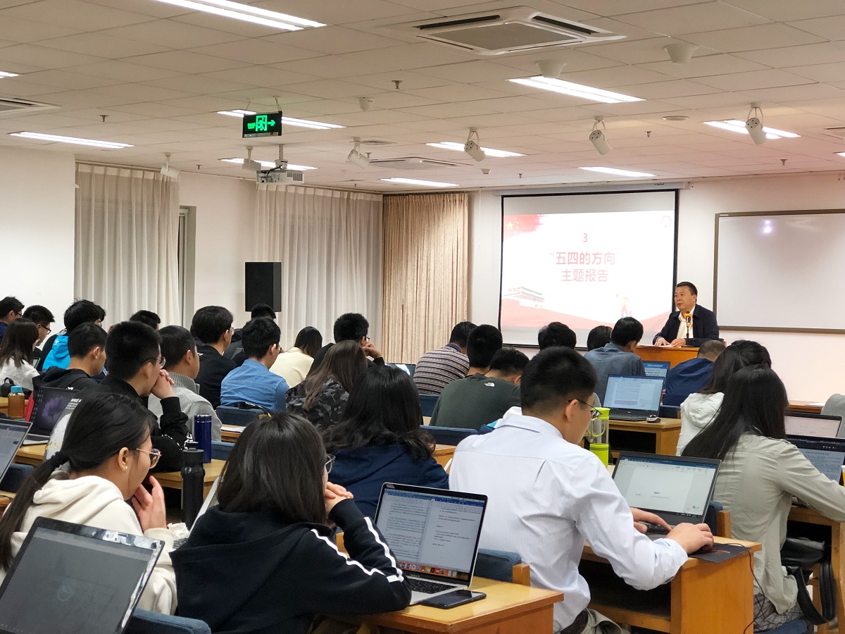 北京大学习近平新时代中国特色社会主义思想研究院副院长、中文系教授韩毓海此次主题报告的题目为“五四的方向”。韩毓海老师首先带领大家一起回顾了历史上纪念五四运动的几次重要讲话,结合党的十八大以来取得的众多重要成就和习近平总书记在中共中央政治局第十四次集体学习时的讲话内容,对习近平总书记在纪念五四运动100周年纪念大会上的讲话进行更深层次的解读和分析。韩毓海老师讲道:习近平总书记是从大历史观的角度来看待五四运动,在这个背景下我们能够更加客观、辩证地认识五四运动对当今时代的作用,能够看到五四精神更长远更持久的影响和价值;具有根本性转变性质的五四运动不仅是从旧民主主义革命到新民主主义革命的转变,也是中华民族和中国人民主动应对外来侵略、寻求改革良方的卓有成效的社会实践。韩毓海老师勉励大家:五四运动只是序曲,当下才是中华民族伟大复兴的高潮,两个一百年的奋斗目标给当代青年赋予了时代重任,大家一定要牢记总书记的嘱托,为自己的精彩人生、为祖国的繁荣富强和为中华民族的伟大复兴作出无悔的贡献。