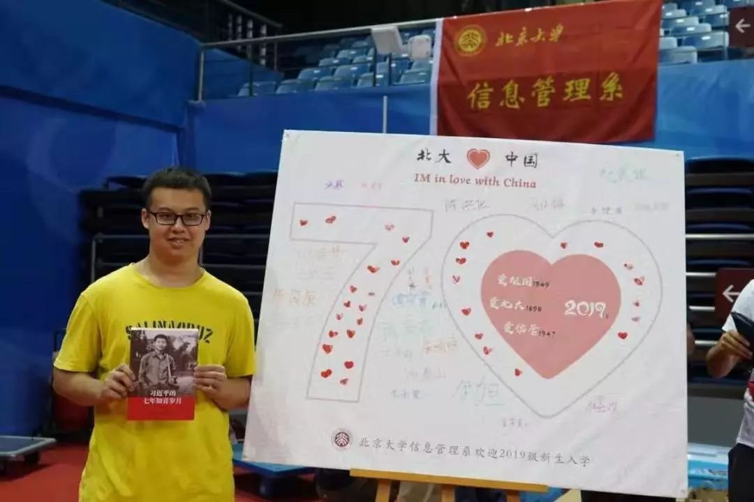 热情的迎新师生井然有序地帮他完成了身份验证、档案收取、礼包发放、签名绘心等一系列流程,并在信管系祝福祖国70周年生日的主题迎新展板前拍照留念。