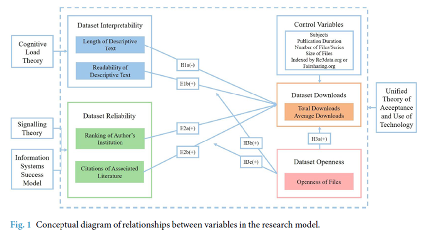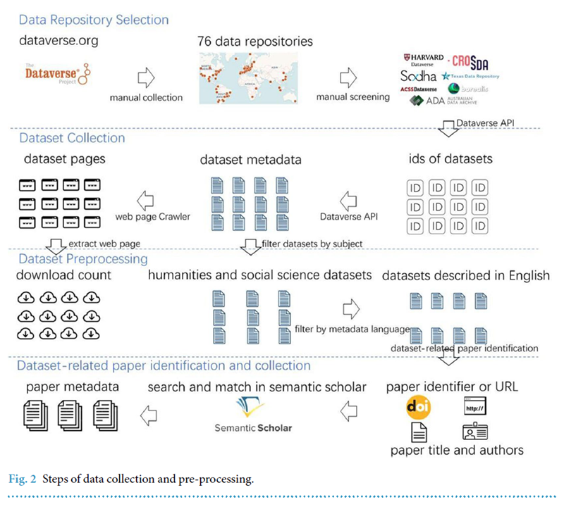 该文采集了来自69个不同数据仓储的55473个数据集的元数据,并综合采用深度学习等方法从Semantic Scholar数据库中识别并获取了26955篇数据集的关联文献(如下图所示),最后采用回归分析对科学数据集下载行为的影响因素模型进行检验。结果表明,科学数据集的描述文本的长度负向影响下载行为,而描述文本的可读性则与下载行为存在正相关关系;科学数据集的可靠性对其下载行为具有正向影响;此外,科学数据集的开放性起到正向调节作用。该文扩展了UTAUT和信息系统成功等模型和理论在科学数据下载和复用行为的应用场景,并对数据管理者、数据仓储等平台促进科学数据开放共享,释放科学数据价值具有一定的实践启示。