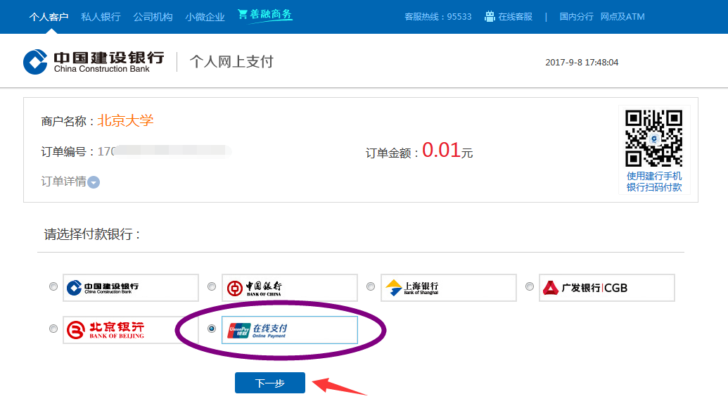 下图为银联在线支付支付方式,如用其他银行支付,请选择“在线支付”,点击“下一步”,进入“银联在线支付”界面,可选400多家银行,通常5000元以上线上支付需使用U盾。