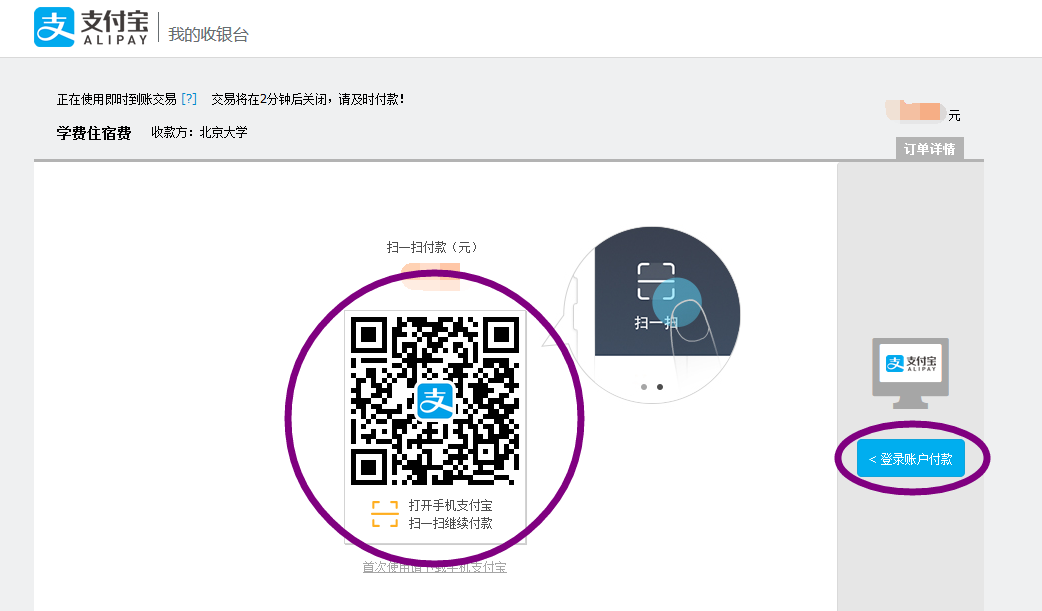 下图为支付宝支付方式,可直接支付宝扫码支付或点击“登录账号付款”。